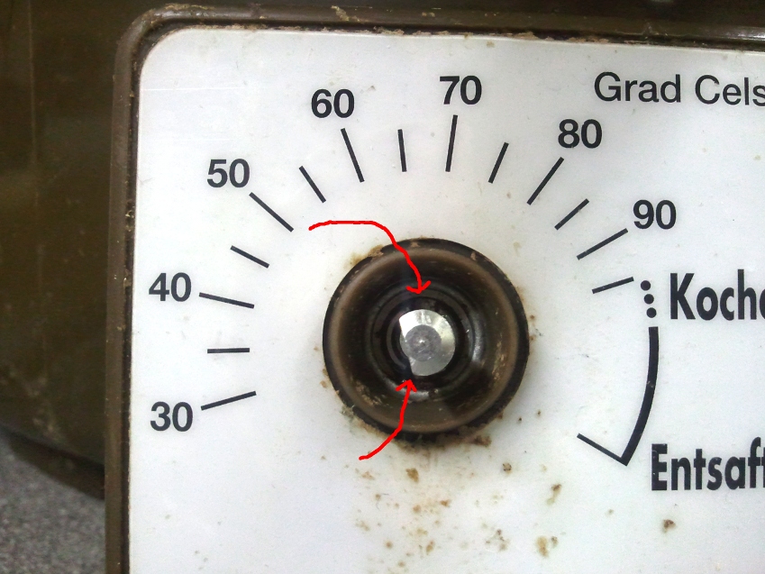The last modification to the kettle is the adjustment of the thermostat. I removed the knob and behind there you see something that looks like a screw with the axle coming right through it. Enter a screw driver and turn it. This adjusts the thermostat so it does not turn off the heating element at boiling temperature...
